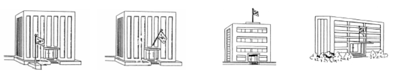 건물 주변 전면 지상의 중앙 또는 왼쪽, 옥상이나 차양시설 위의 중앙, 또는 주된 출입구의 위 벽면의 중앙에 단다
