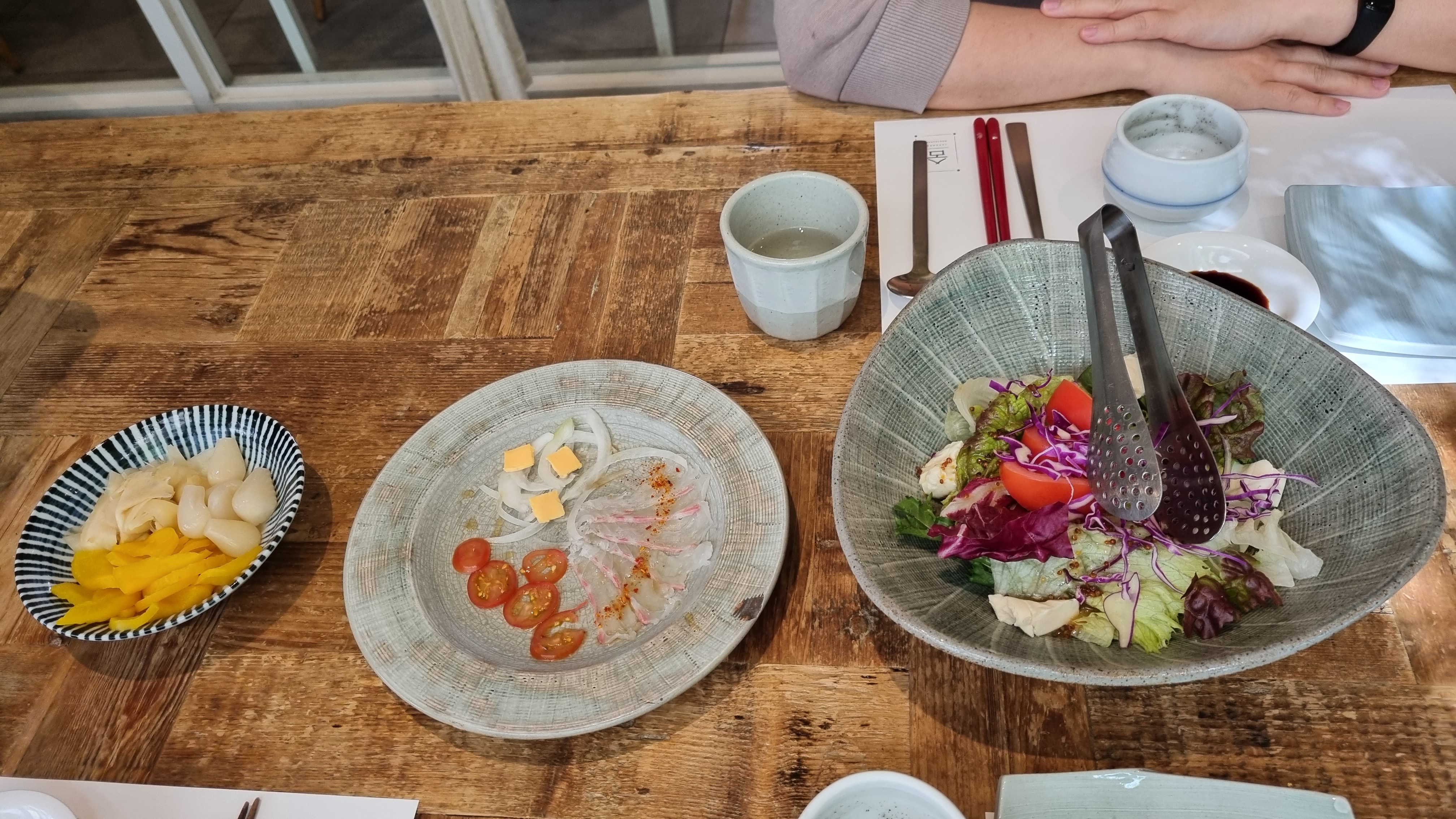 치즈토마토샐러드, 광어가르파쵸, 생강락교단무지도 같이 세팅되었어요