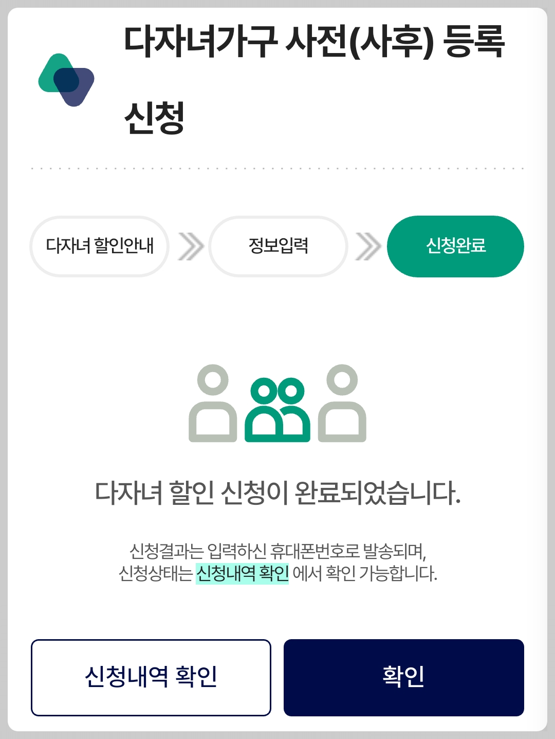 대상여부를 확인했더니 이렇게 다자녀 할인 등록대상자라고 나오네요