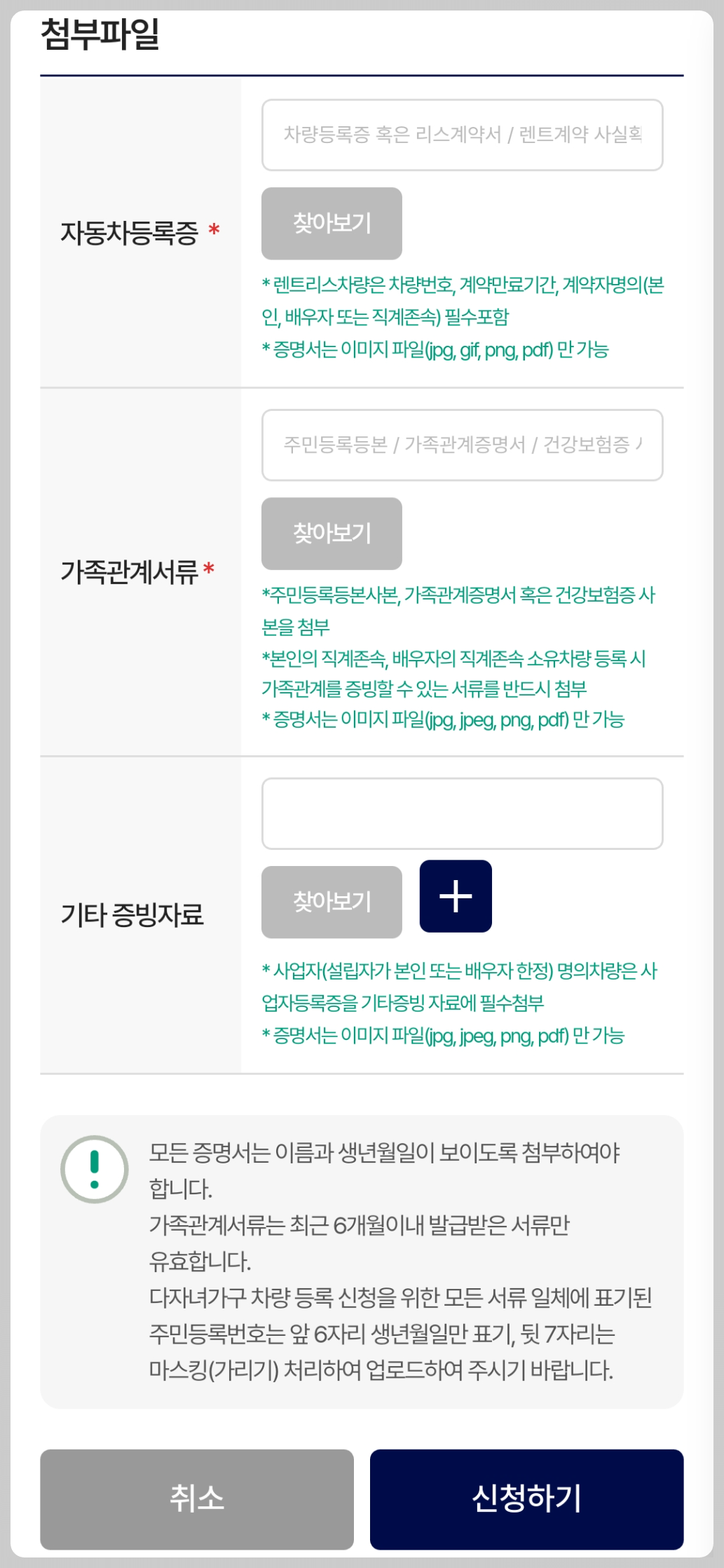 준비해 두신 첨부파일을 찾아보기 버튼을 눌러서 하나씩 첨부해 주시고