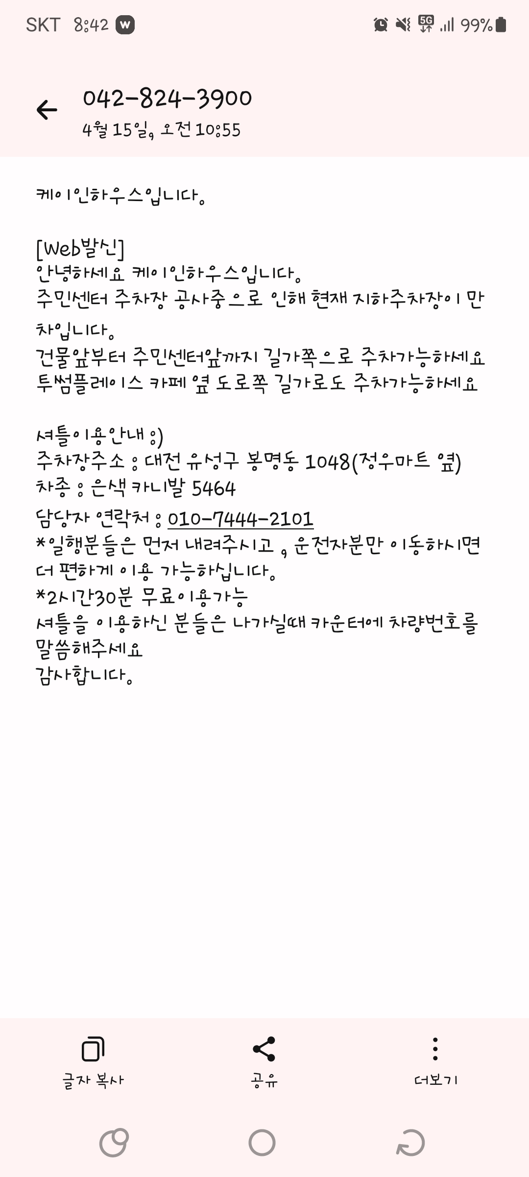 출발 전 주차안내 문자가 왔어요