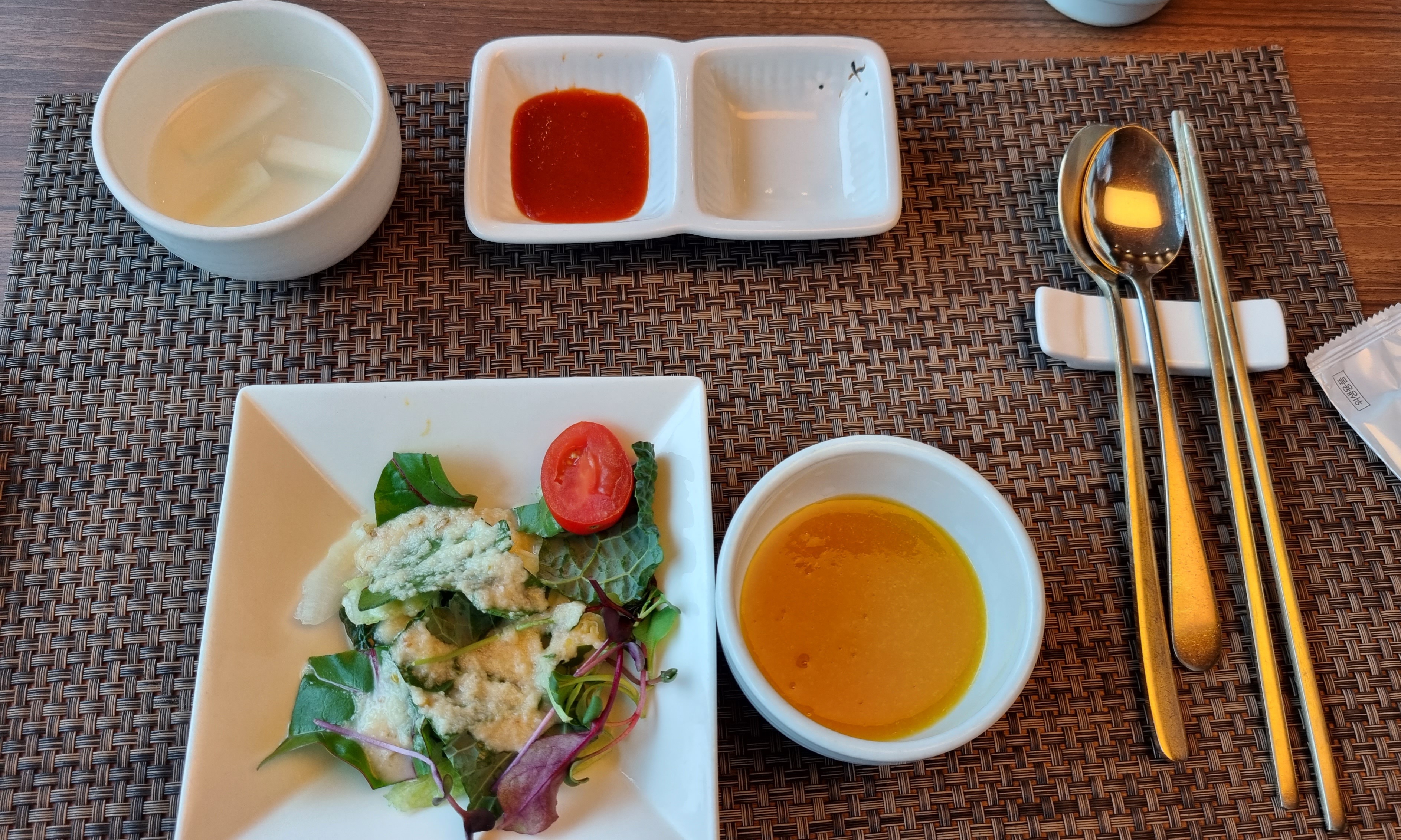 처음 음식으로는 계절죽과 물김치,야채샐러드입니다.