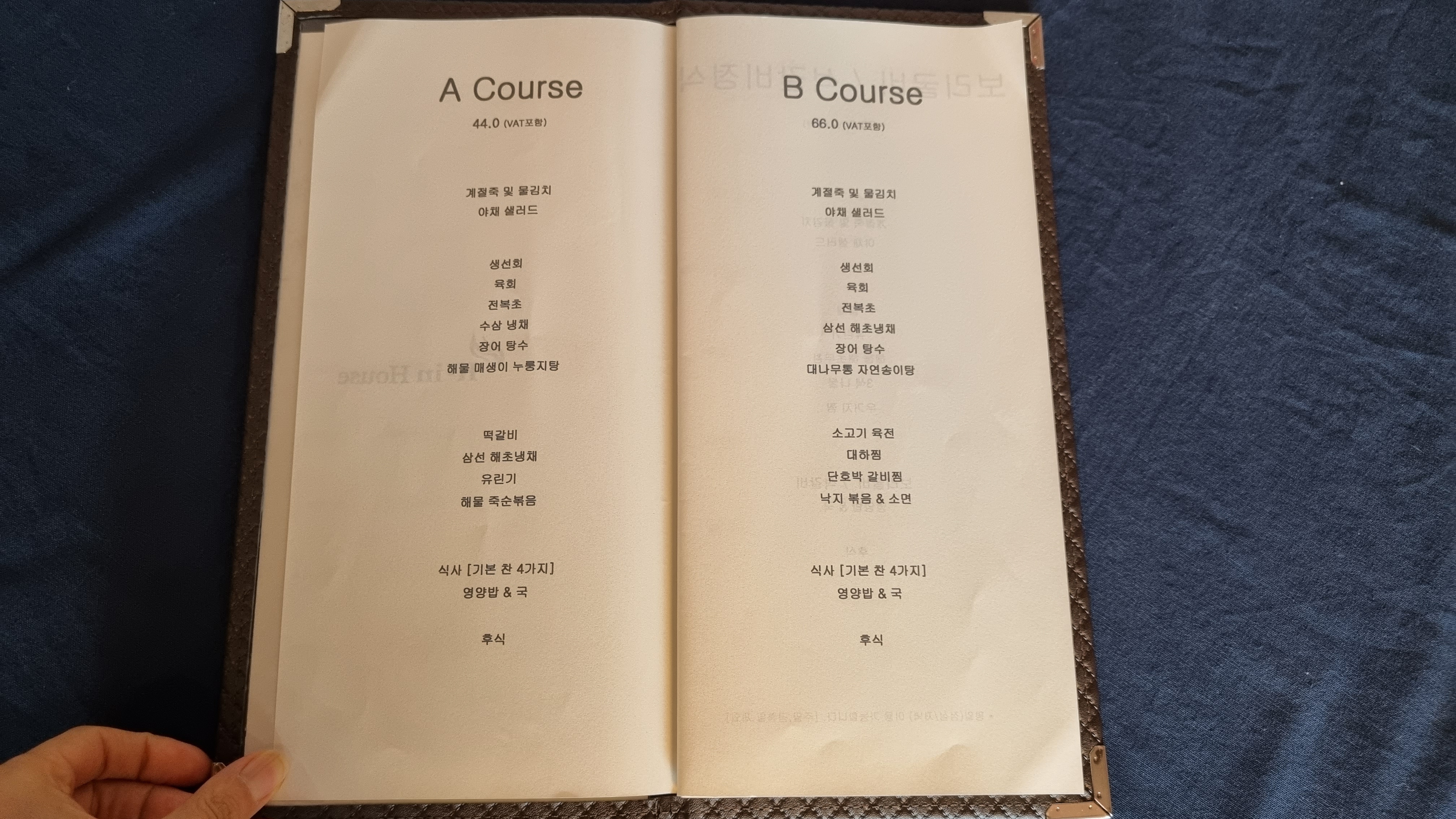 메뉴는 루 A코스, 루 B코스, 보리굴비정식(평일), 석갈비(평일)이 있는데 저희는 루 B로 주문했어요