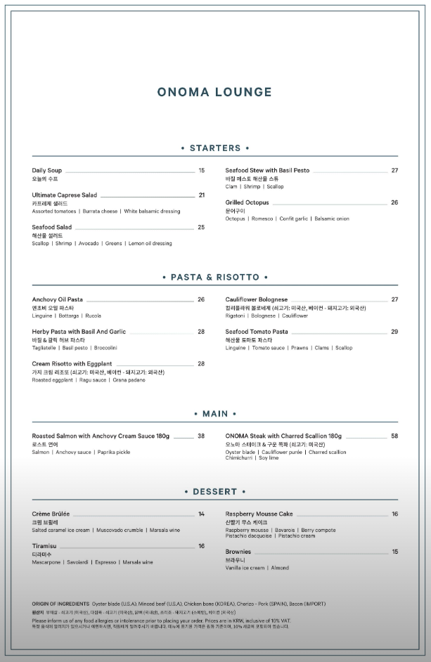 계절마다 제철 식재료를 활용한 코스가 있으니 매계절 방문하면 다양한 코스를 즐길 수 있을 듯해요 지금은 Winter Savory Ⅱ인 겨울코스메뉴와 ONOMA LOUNSE SPECIAL COURSE MENU도 오픈되어 예약이 가능해요