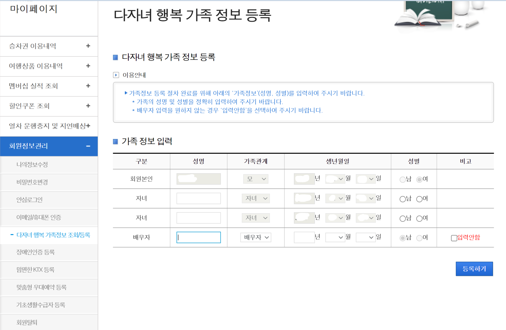 등록할 가족의 성명, 생년월일,성별을 넣어주고 등록하기를 클릭해 주세요