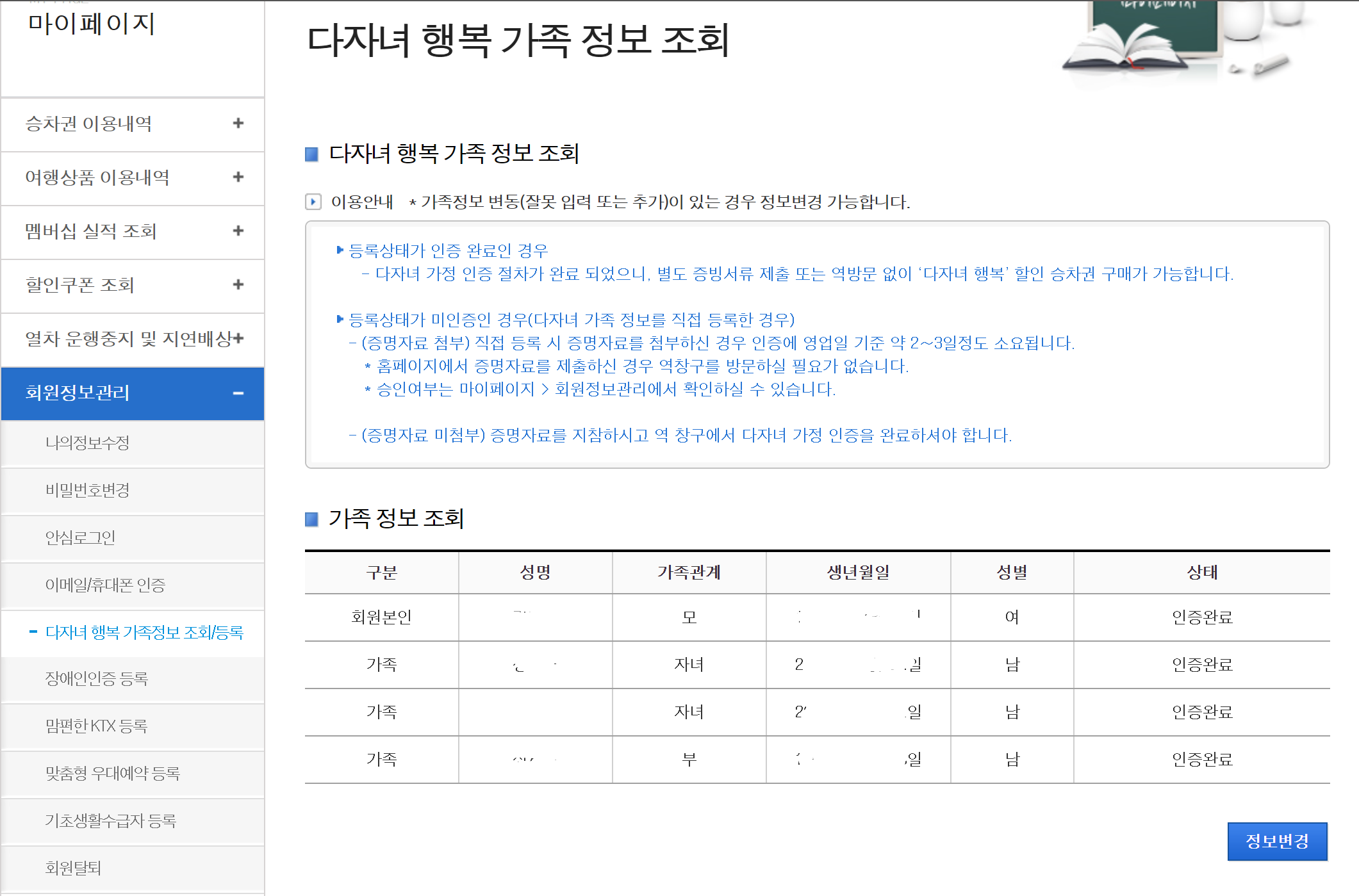 등록상태가 인증완료인 경우 다저녀 가정 인증절차가 완료되어 별도 증빙서류제출 없이 승차권 구매가 가능해요