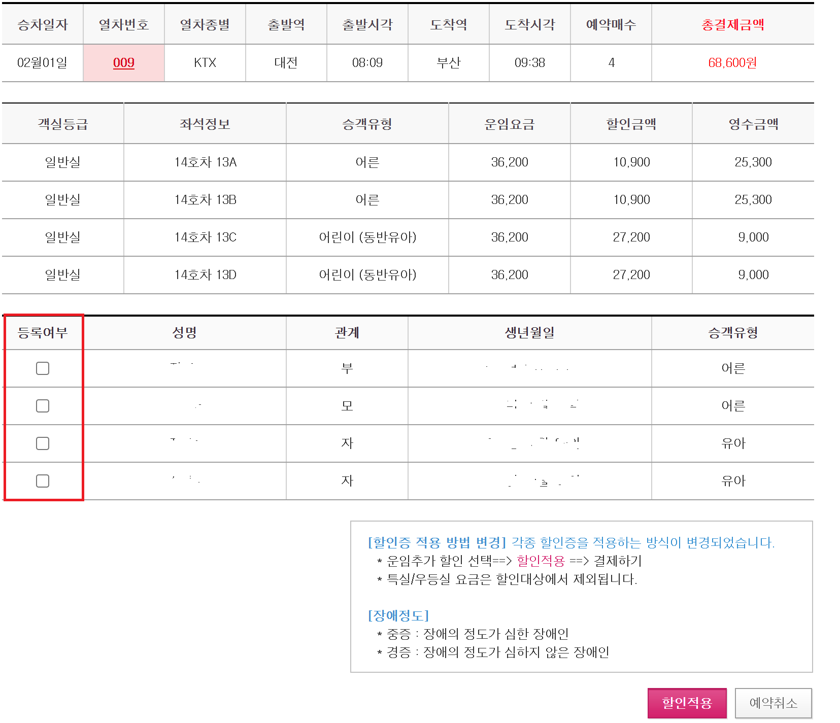 등록여부에 탑승하실 분을 체크해 주시고