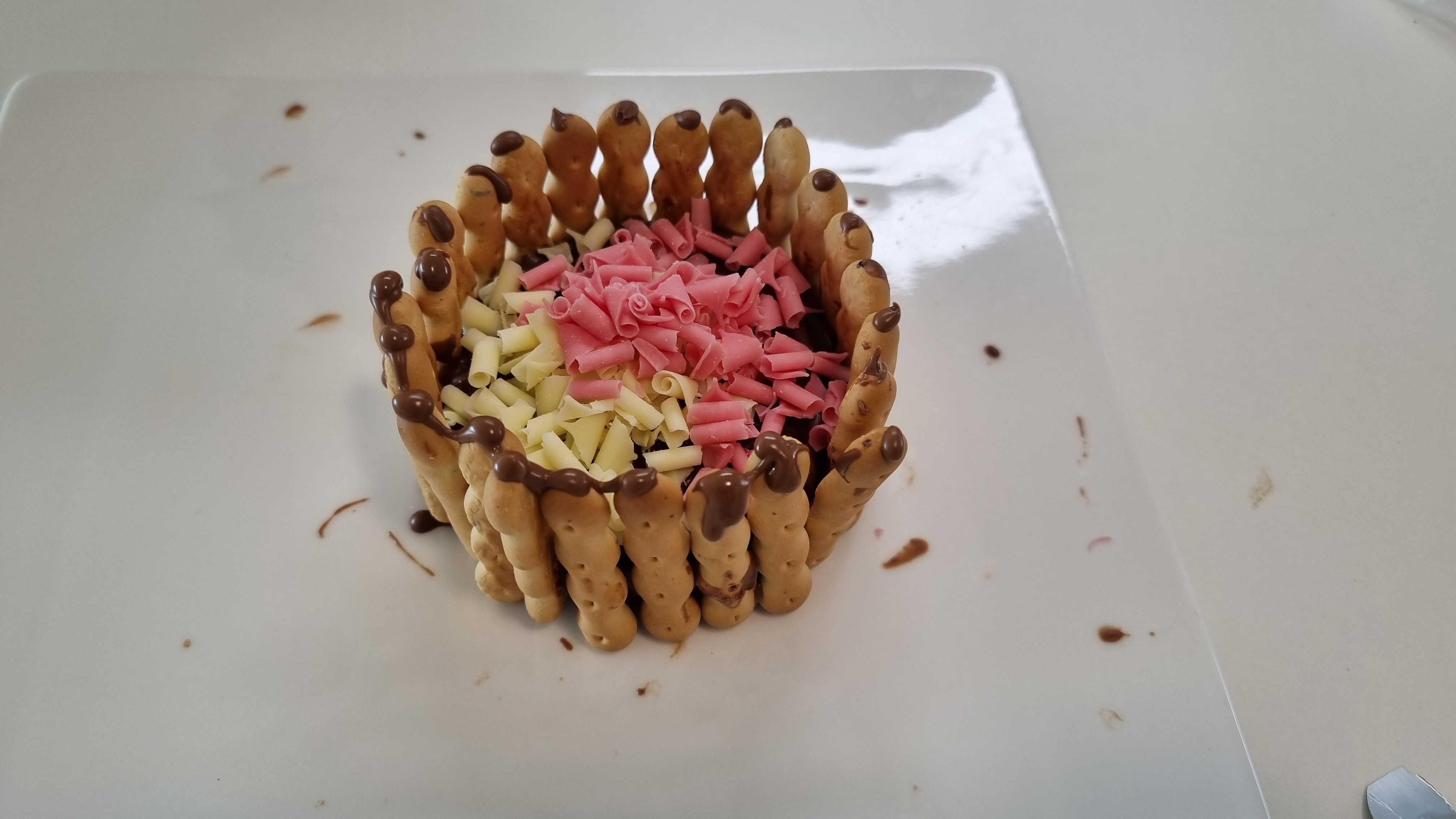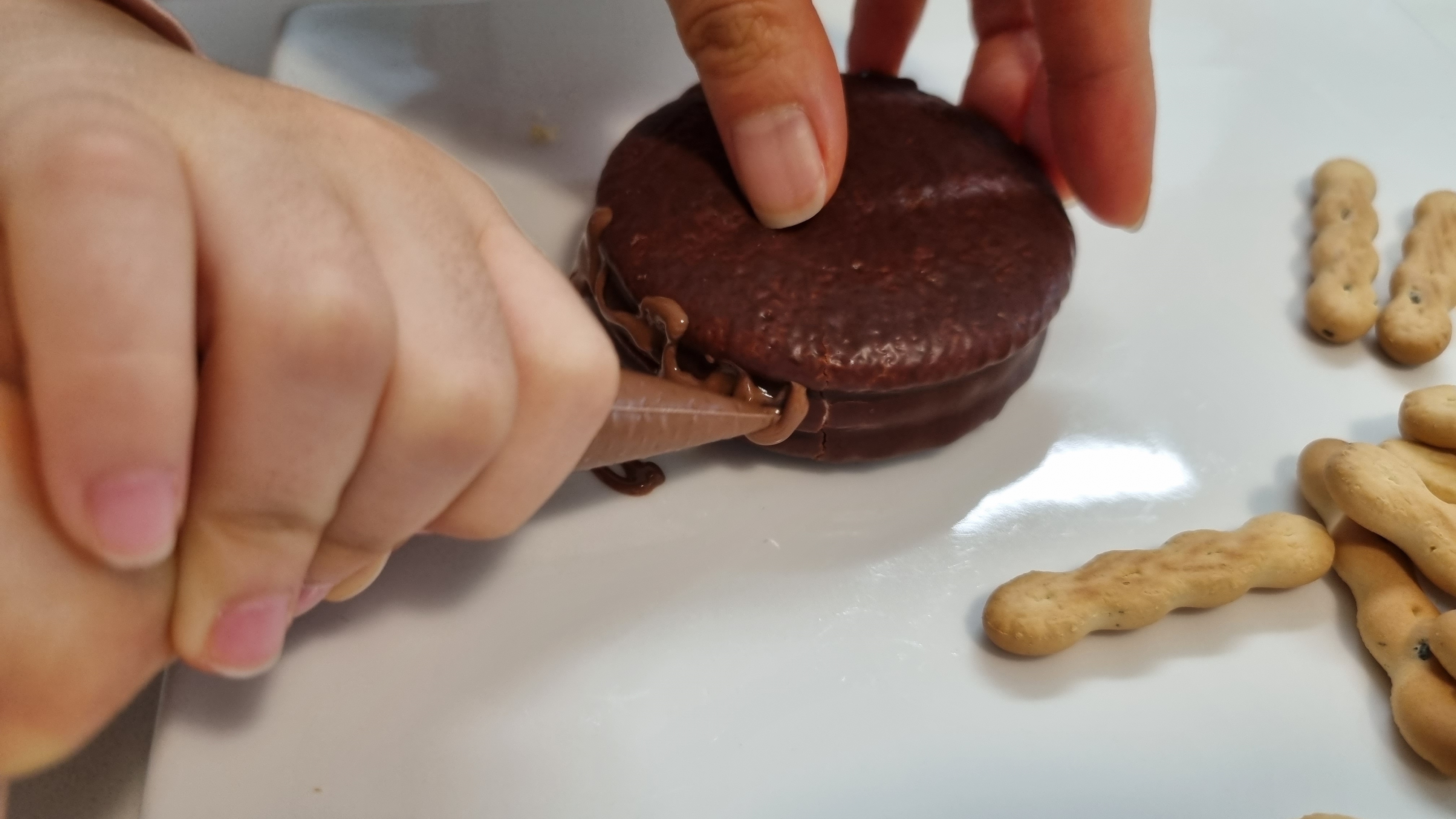 파이 양옆으로 초코렛을 발라가며