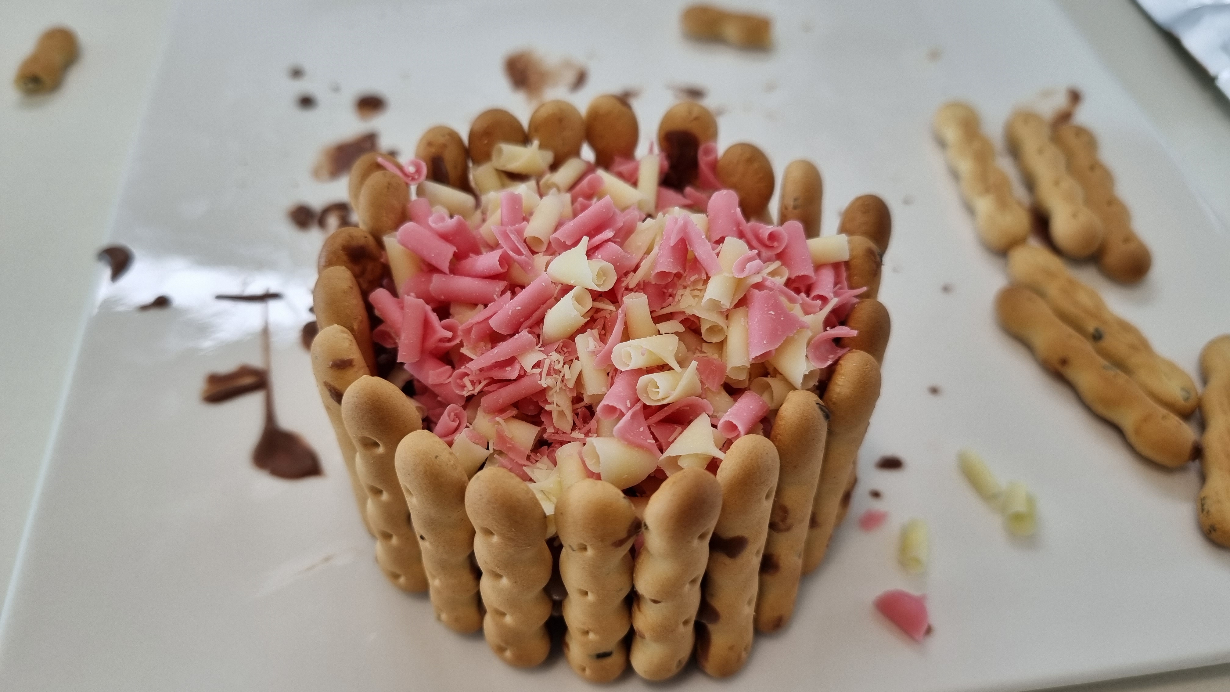 초코파이를 빙 둘러서 과자를 다 붙여주었어요