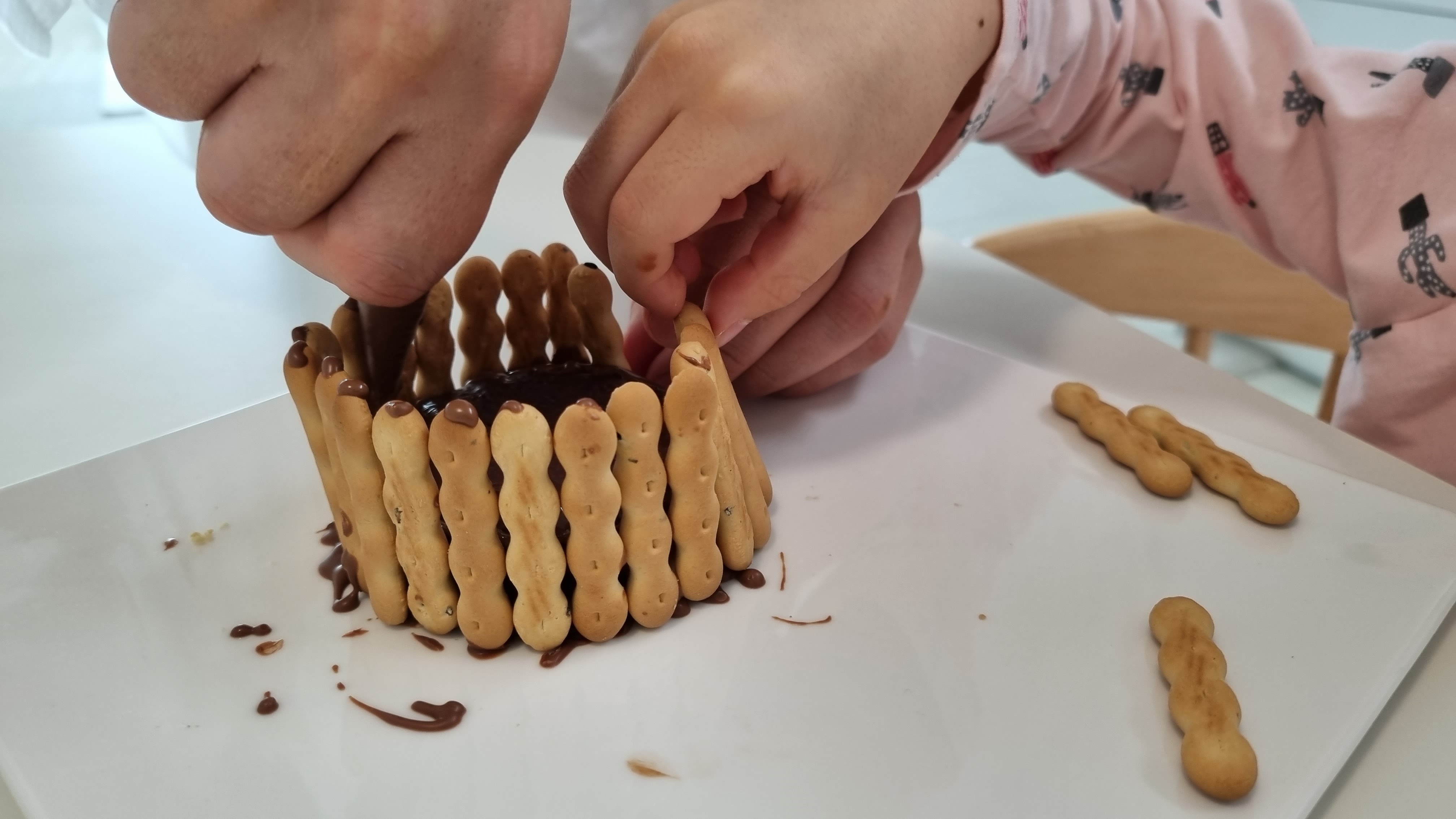 굳을 때까지 천천히 과자를 붙여줘요