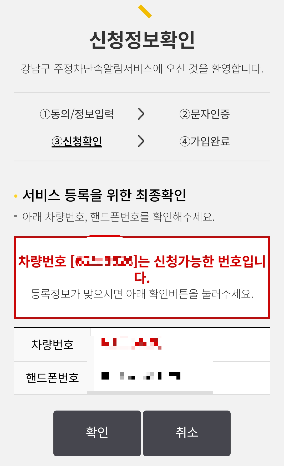 신청정보확인에 차량번호와 핸드폰번호가