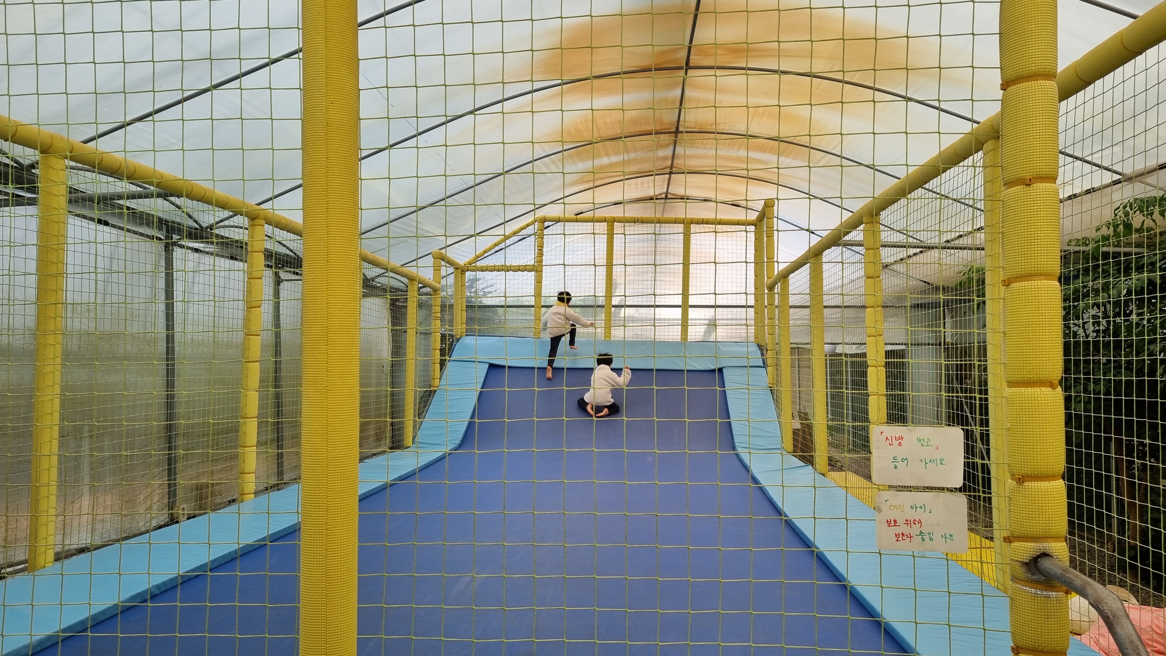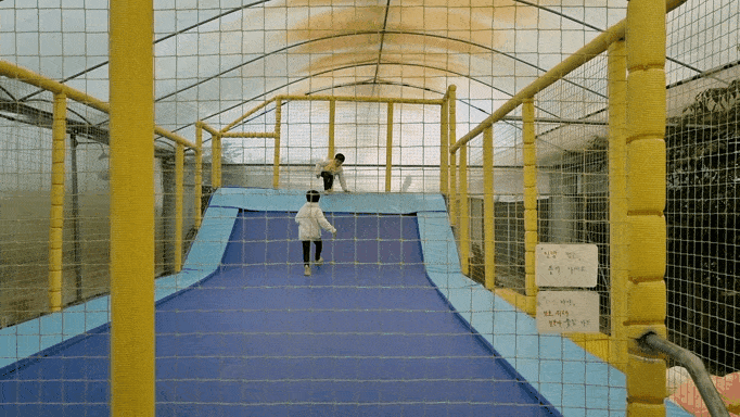 모이를 다 주고 새장반대편으로 가면 모래놀이터와 휴게공간, 대형트램펄린, 화장실이 있어요