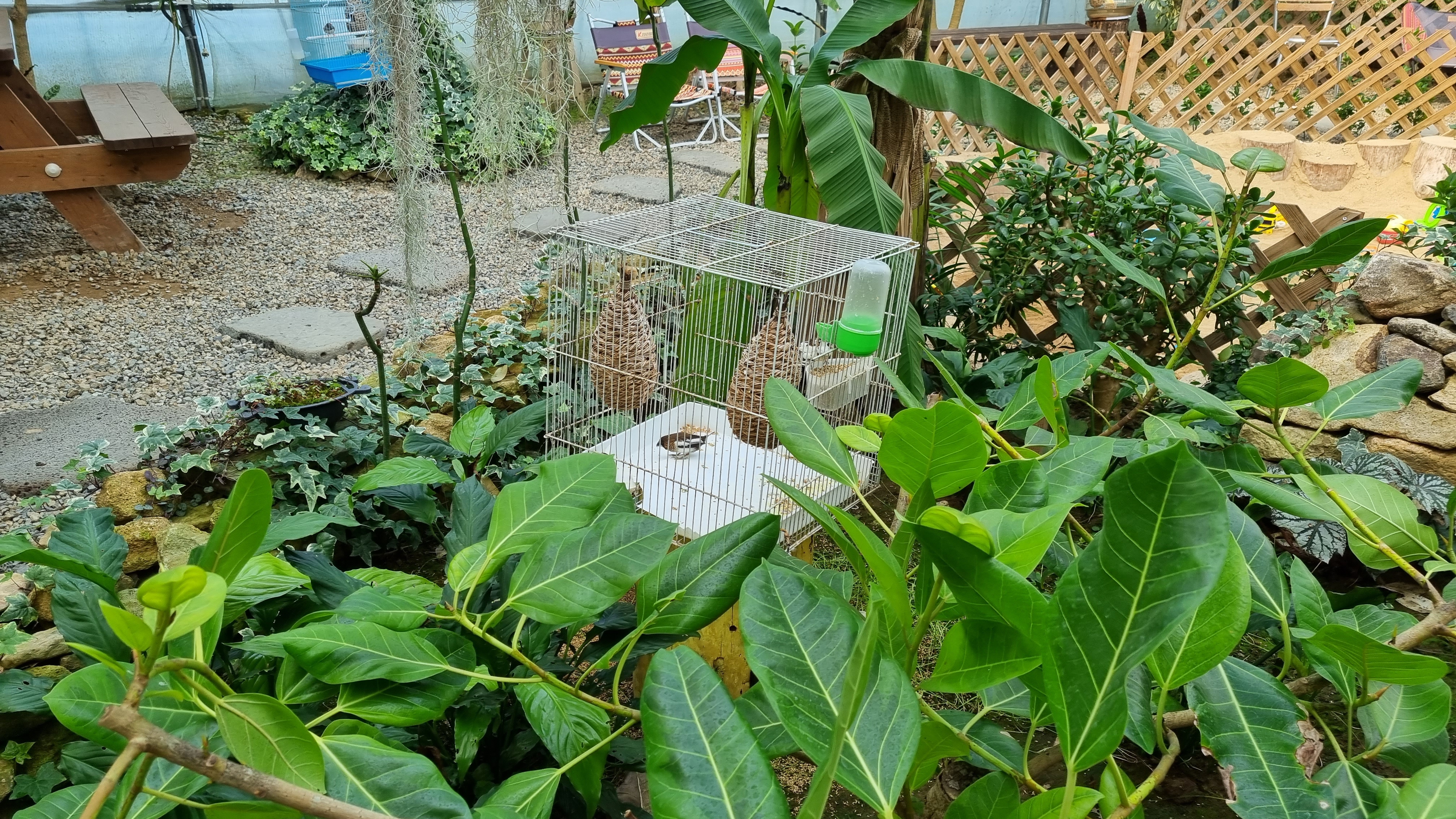 사랑앵무가 있는 큰 새장은 문을 열고 들어갈 수 있어요